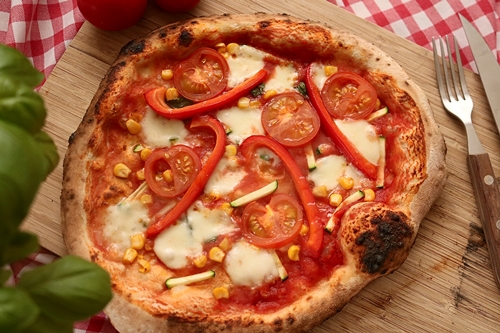 Pizza geht auch mal vegetarisch: Mais, Paprika und Zucchini. Wem sonst noch Gemüse einfällt, was auf die Pizza soll, rauf damit! Total lecker…