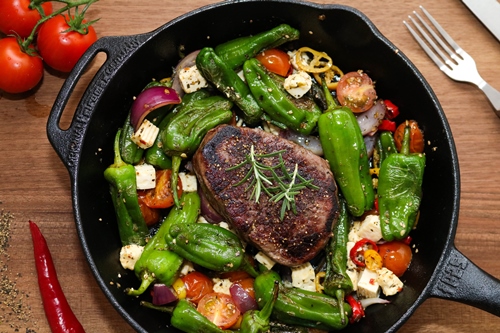 Rinderfilet und Pimientos de Padrón mit buntem Gemüse ist eine super Kombination und liefert Hauptspeise und Beilage in einer einzigen Pfanne…