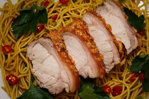 Saftiges Fleisch und eine knusprige Kruste sind immer gut. Wir servieren es auf einem leckeren Spaghetti-Salat - im Nu hat man ein leckeres Gericht!
